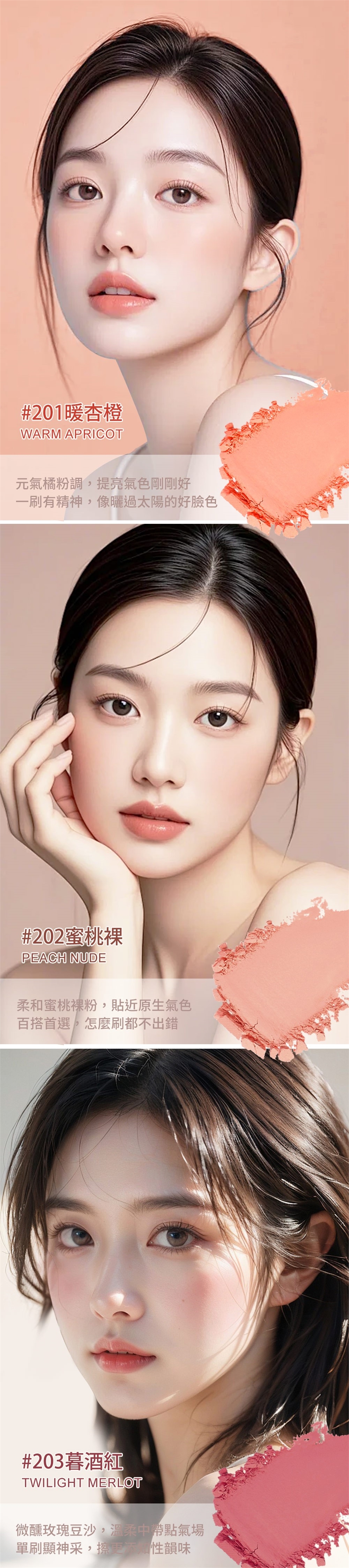 裸紗柔霧腮紅:以指腹或刷具沾取適量,暈染於雙頰。