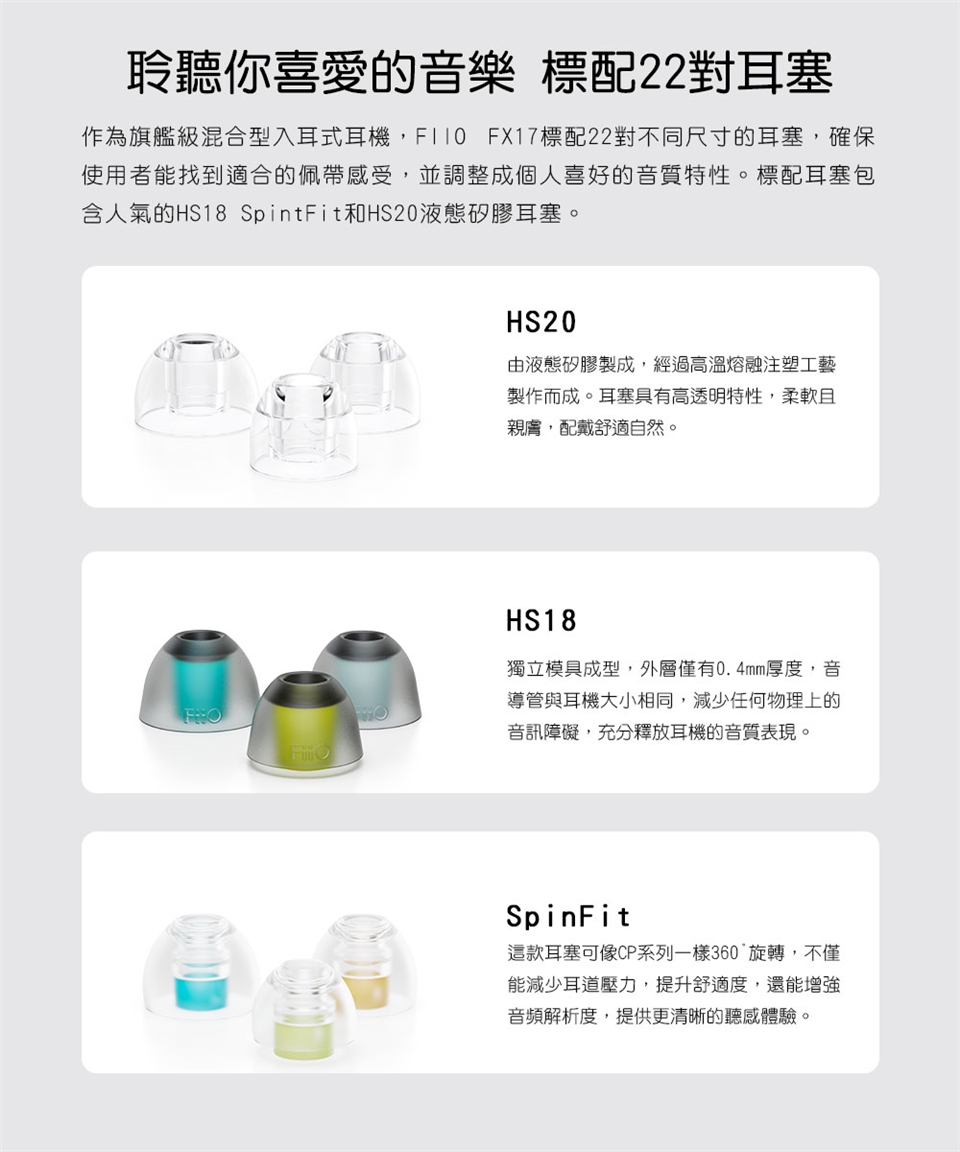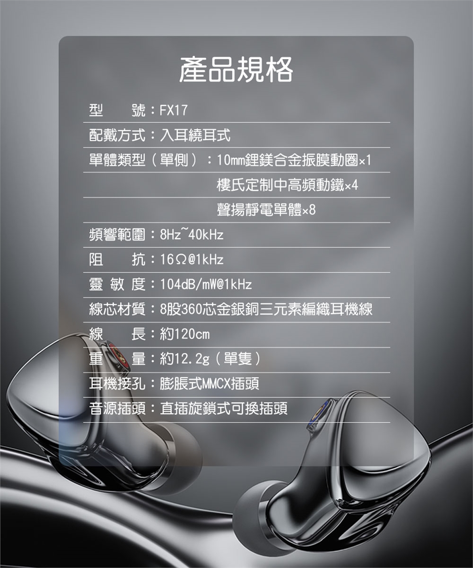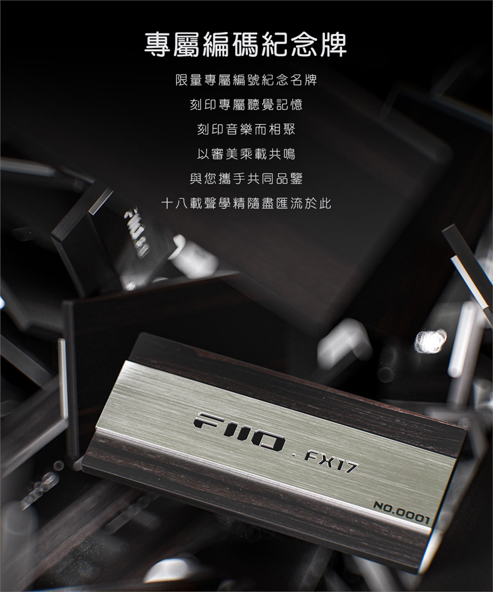 本產品僅包含FX17耳機*1組、金銀銅編織可換插頭耳機線*1、3.5mm/4.4mm插頭*各1、專屬編號紀念牌*1、海綿耳塞*2對、低頻耳塞/均衡耳塞/人聲耳塞*各3對、雙節耳塞*2對、HS20耳塞*3對、SpintFit耳塞*3對、HS18耳塞*3對、磁吸線夾*1、清潔刷*1、MMCX快拆輔助器*1、清潔布*1、HB5收納盒*1、說明書*1。