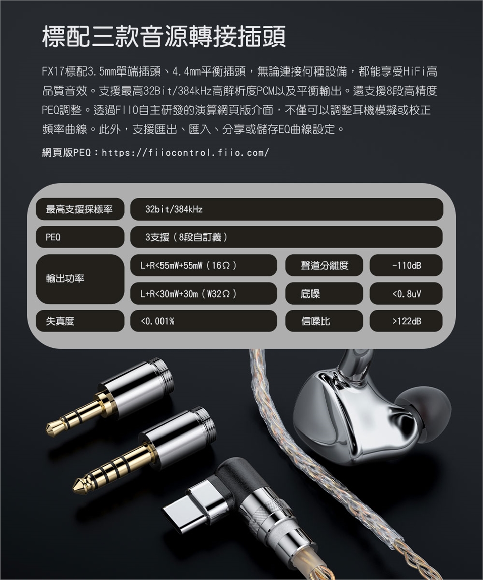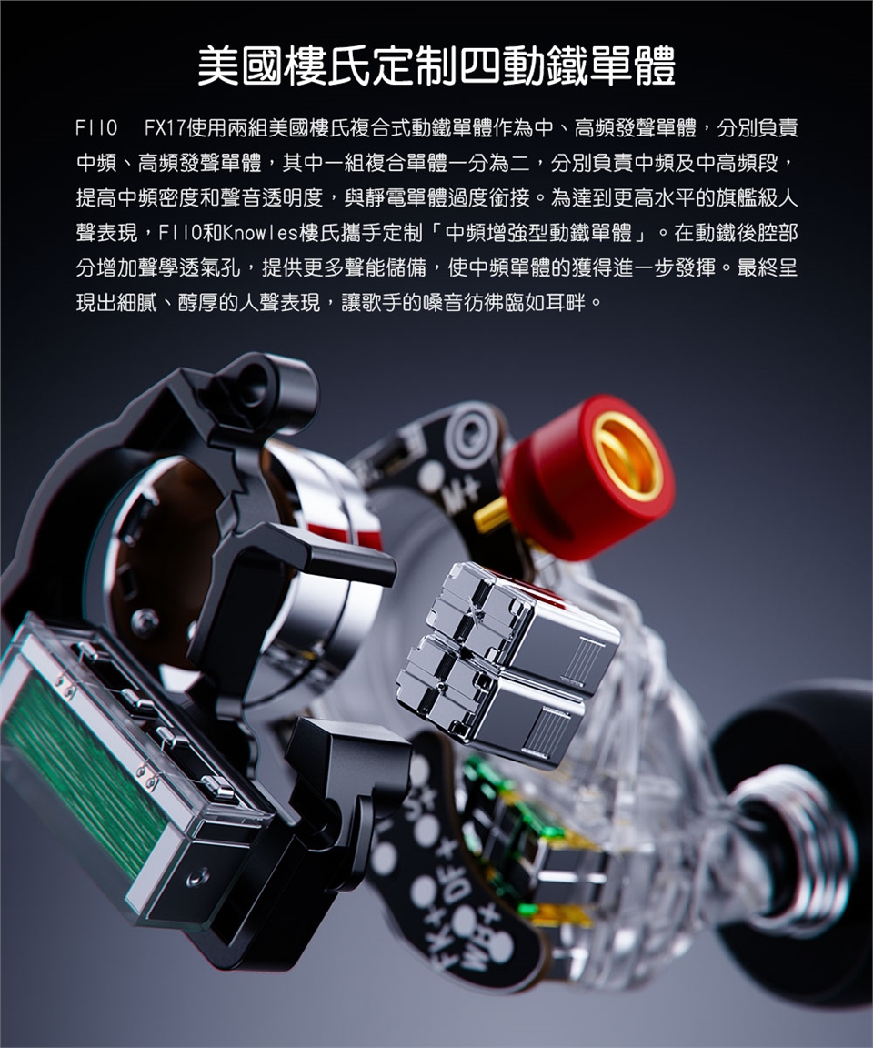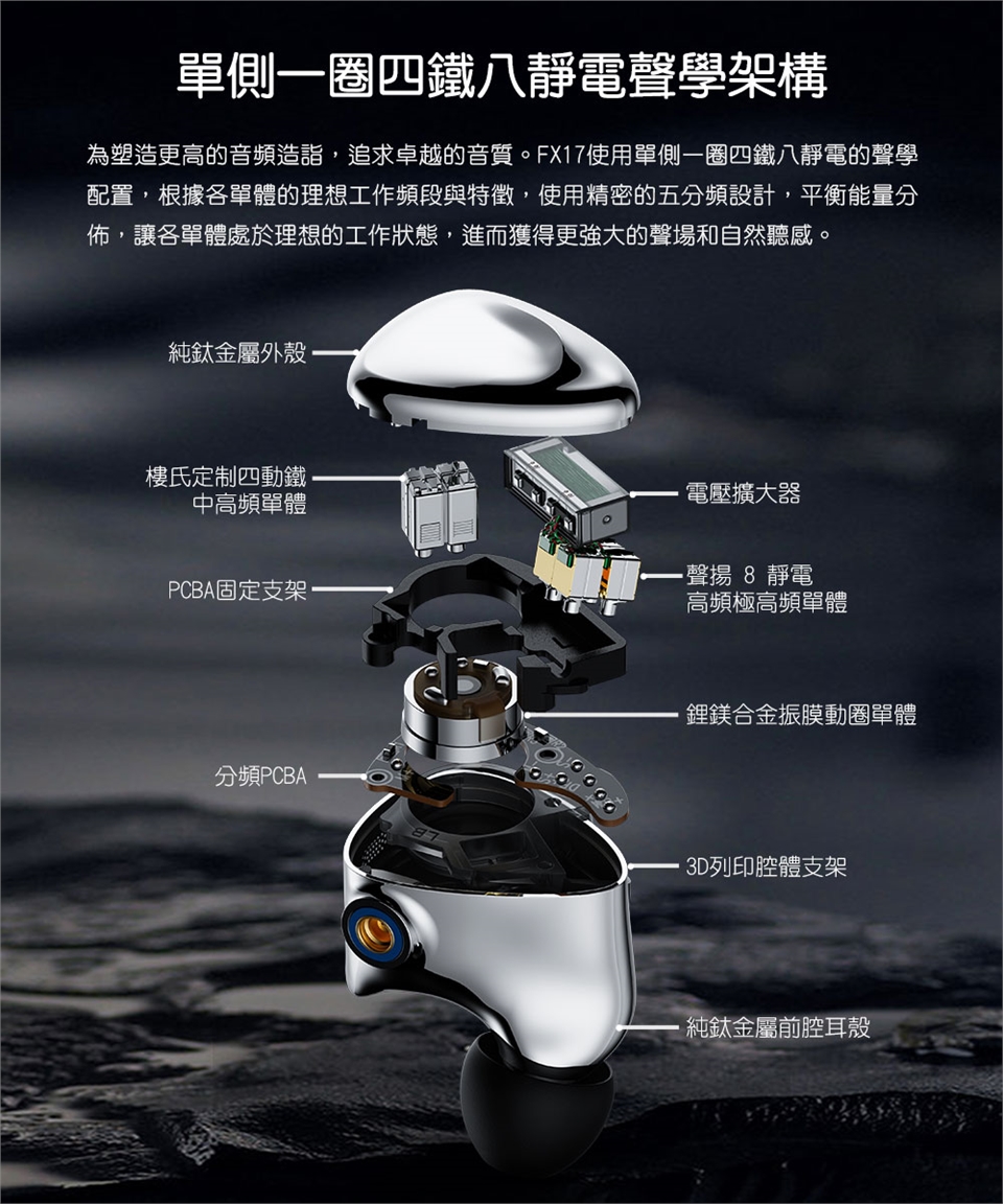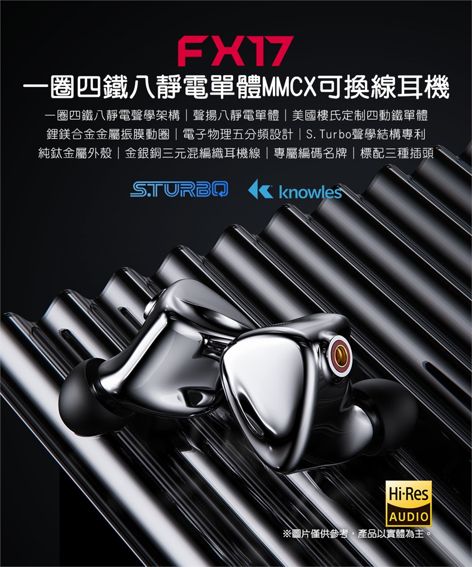 本產品僅包含FX17耳機*1組、金銀銅編織可換插頭耳機線*1、3.5mm/4.4mm插頭*各1、專屬編號紀念牌*1、海綿耳塞*2對、低頻耳塞/均衡耳塞/人聲耳塞*各3對、雙節耳塞*2對、HS20耳塞*3對、SpintFit耳塞*3對、HS18耳塞*3對、磁吸線夾*1、清潔刷*1、MMCX快拆輔助器*1、清潔布*1、HB5收納盒*1、說明書*1。