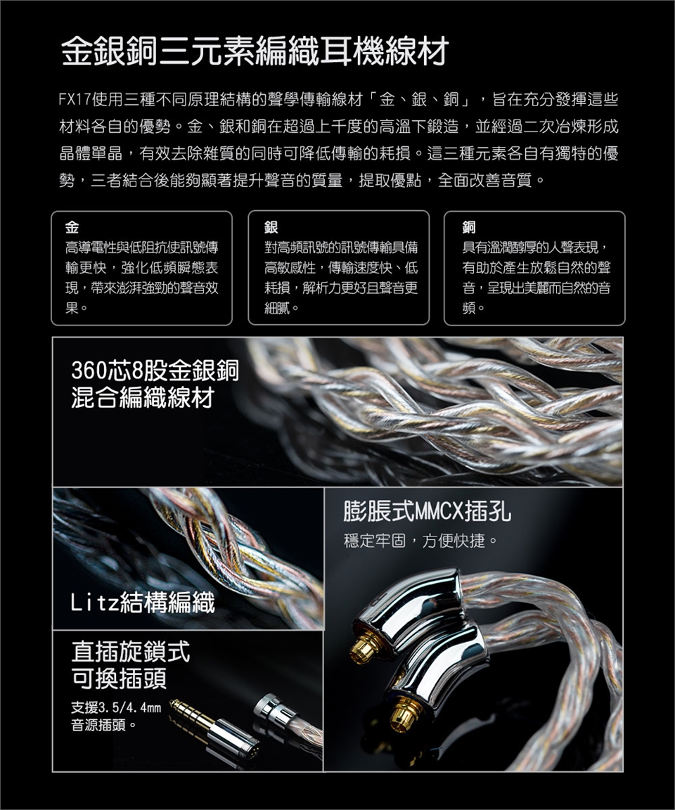 線芯材質:8股360芯金銀銅三元素編織耳機線