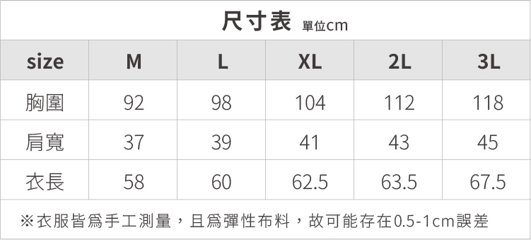 尺寸:M、L、XL、2XL、3XL (詳情請見下方圖片)