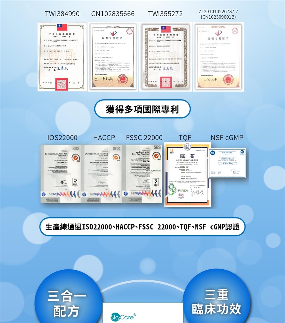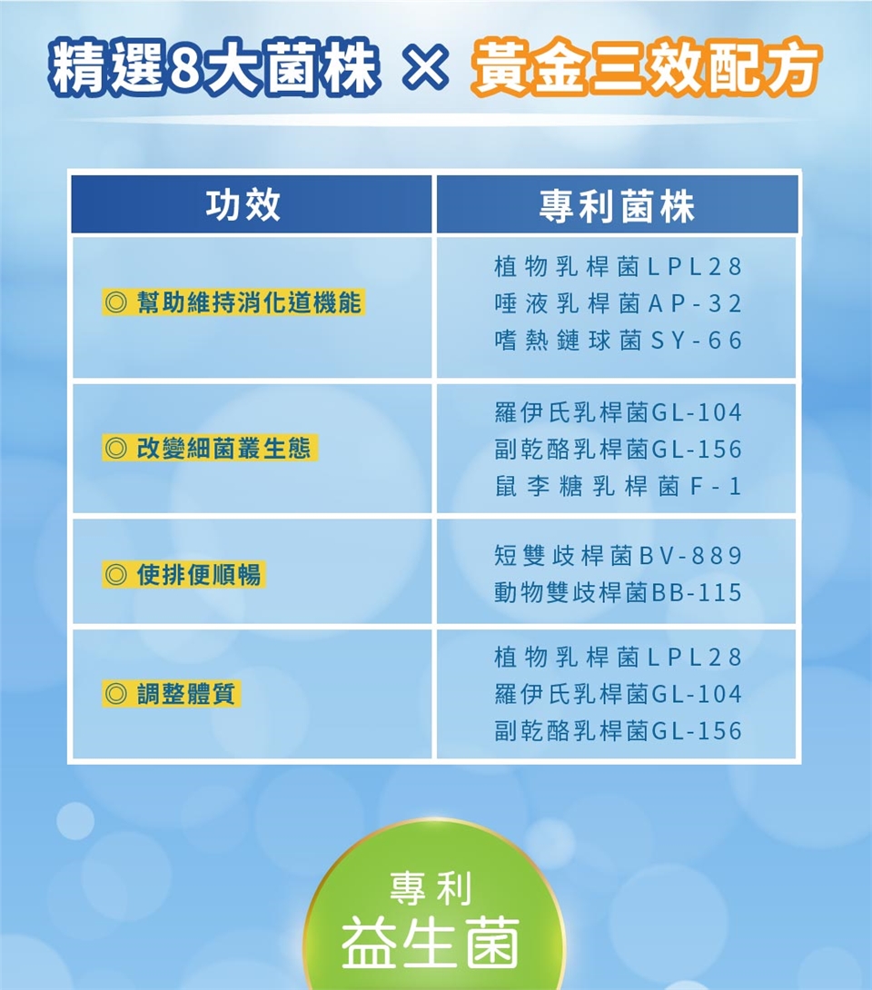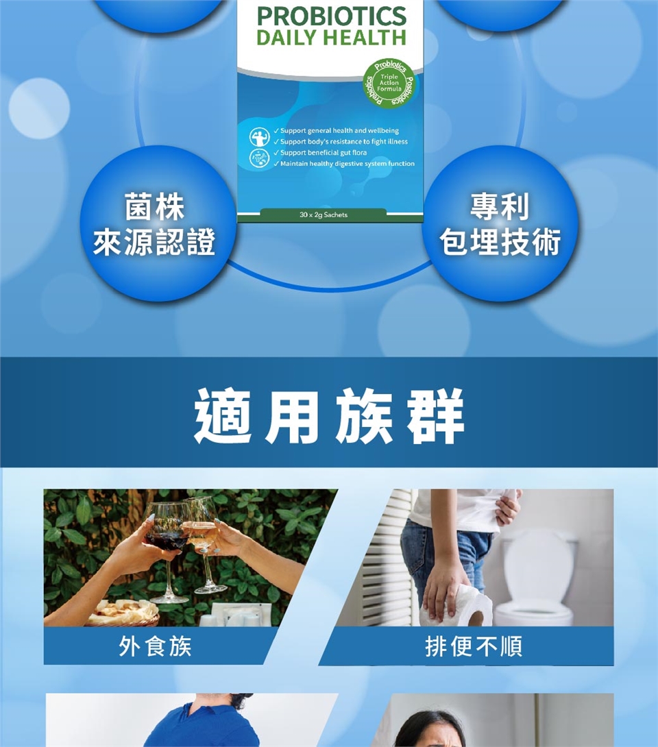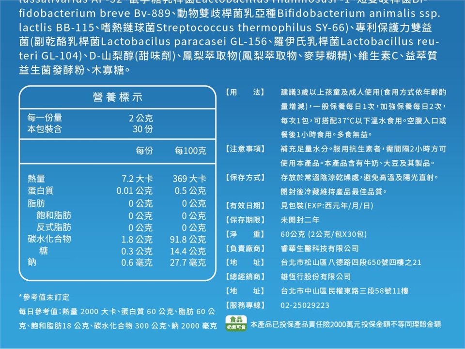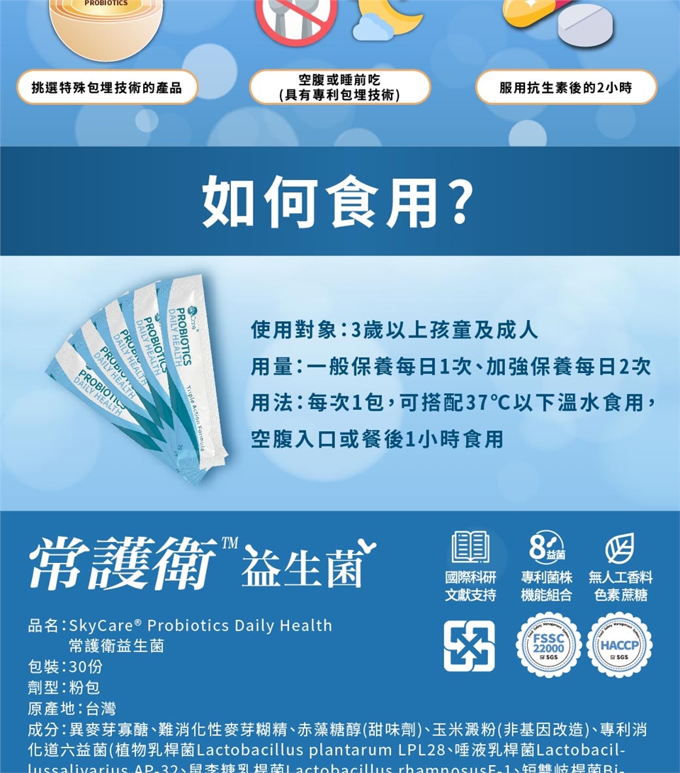 注意事項:補充足量水分。服用抗生素者,需間隔2小時方可使用本產品。本產品含有牛奶、大豆及其製品。