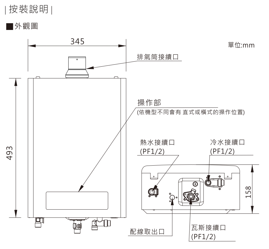 *強排氣熱水器超出標準安裝的管材需依照現場環境計價,安裝需要有110V的插座,若現場無插座或距離較遠請"自備"延長線或轉接頭,原廠技師不會協助接電線、準備延長線