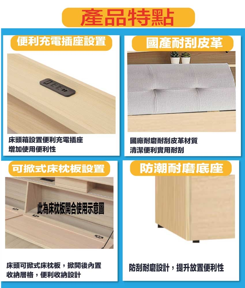 搭配床頭可掀式床枕板+內&外開放層格+便利插座設置加床底座三邊開合六抽屜等收納空間設計
