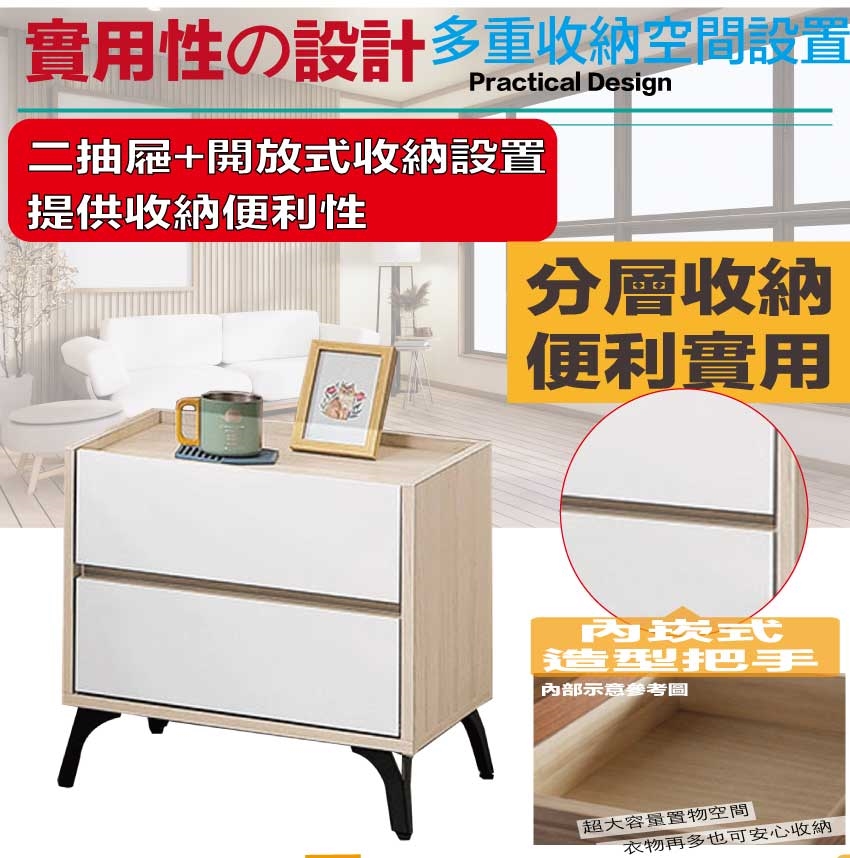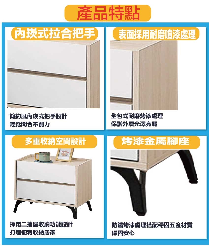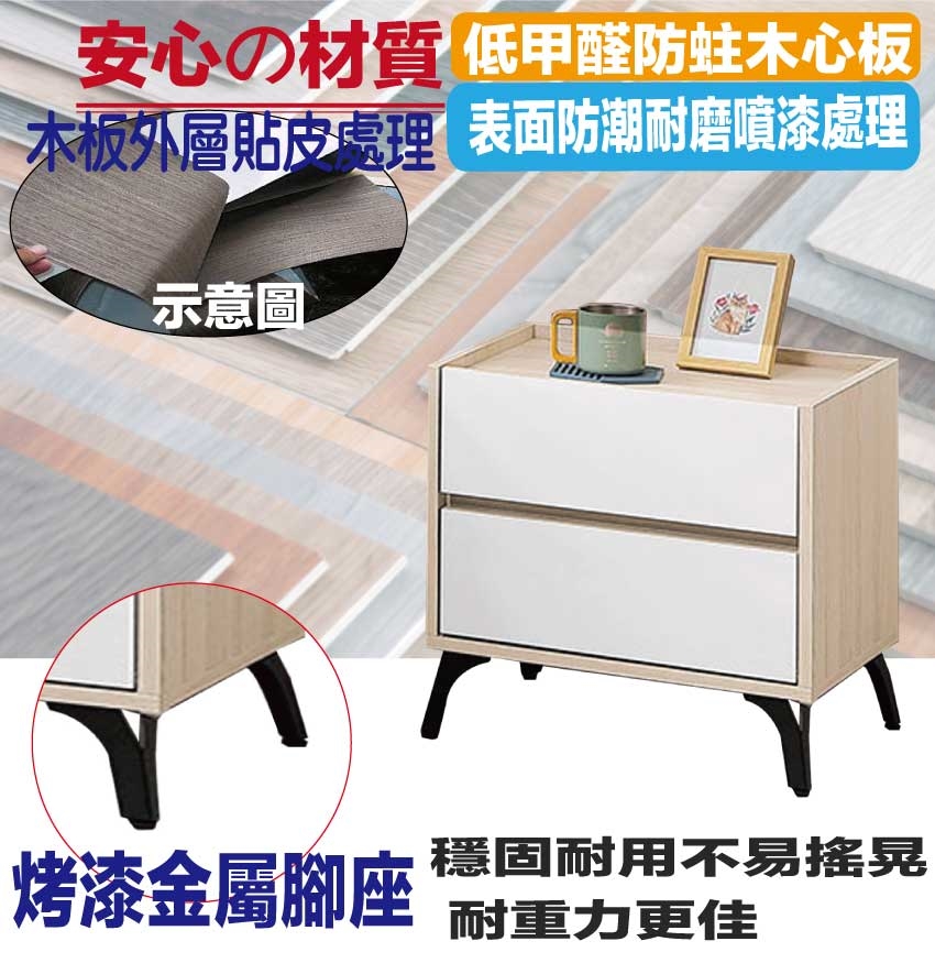 【文創集】山多利雙色1.7尺二抽床頭櫃 木紋雙色系+安心材質製造,使用放心+搭配居家更便利,採用防蛀木心板+烤漆金屬腳座+五金滑軌結構等安心材質製造 ,外層採用防潮耐磨噴漆處理搭配採用二抽屜+開放式桌面等收納空間設計,全由專人配送到家,專業安心服務,替你省下更多時間!