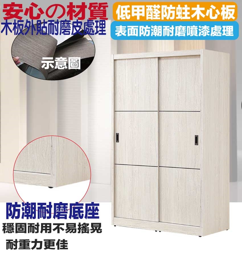 【文創集】得卡利4尺推門衣櫃 淺橡木紋色系+安心材質製造,使用放心+搭配居家更便利,採用防蛀木心板+五金滑軌結構+防潮耐磨底座等安心材質製造 ,外層採用防潮耐磨噴漆處理搭配採用推門櫃+吊衣桿+單抽屜+內開放層格等收納空間設計,全由專人配送到家,專業安心服務,替你省下更多時間!