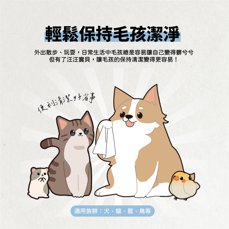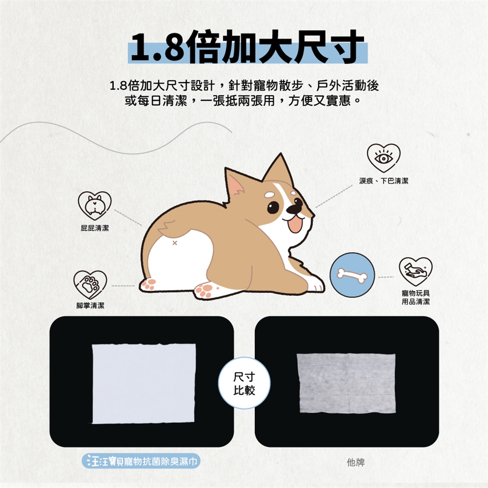 ✅1.8倍加大尺寸設計,針對寵物散步、戶外活動後或每日清潔,一張抵2張用,方便又實惠。