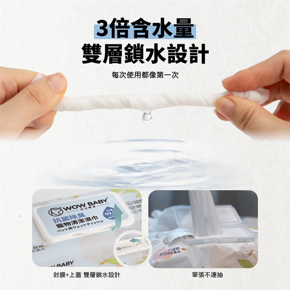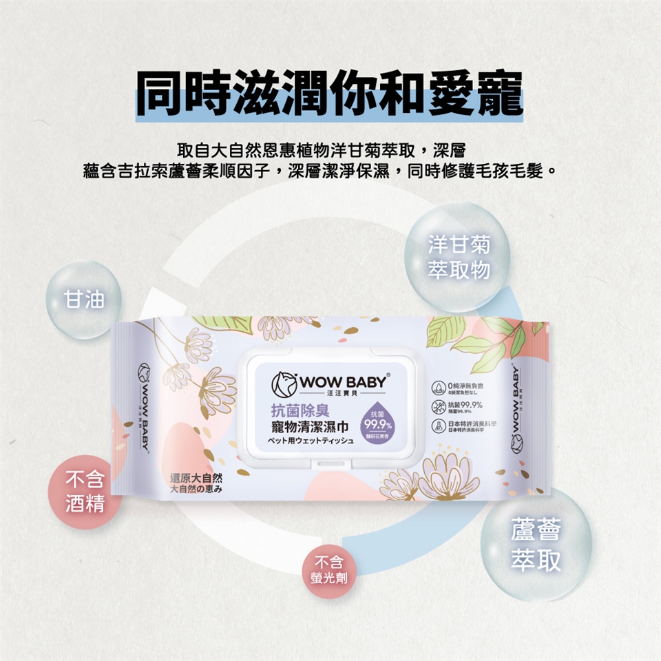 ✅專為毛孩設計抗菌99.9%除臭柔濕巾,蘊含馥郁花果香氛,清新淨化異味,昇華寵物肌膚防護力!