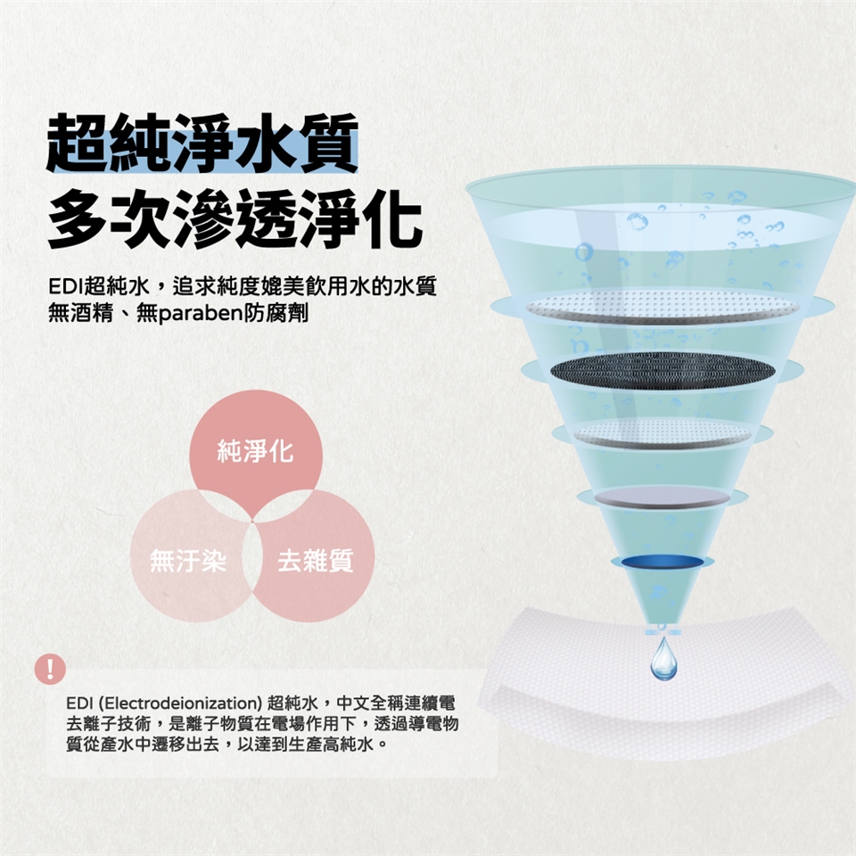 ✅ 99.9%雙重淨化EDI超純水,無香料,無酒精,無paraben防腐劑,更安心。