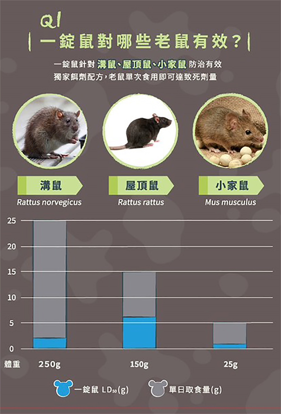 每個毒餌站放置15~20公克,置於老鼠洞口或其必經之處,每隔5~10步放置一站。施藥後每隔7~10天,應巡視餌站,並補充已被消耗之毒餌,通常換2~4塊毒餌,已足夠完全消除附近之野鼠。