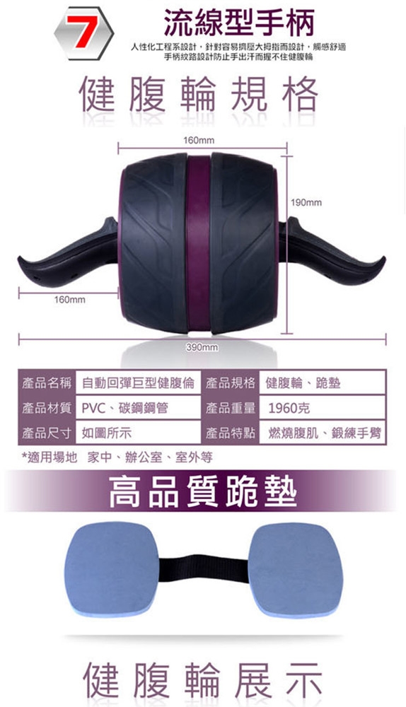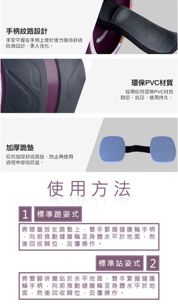 1.標準跪姿式:將膝蓋放在跪墊上,雙手緊握健腹輪手柄,向前推動健腹輪至身體水平於地面,然後回收歸位,反覆操作。