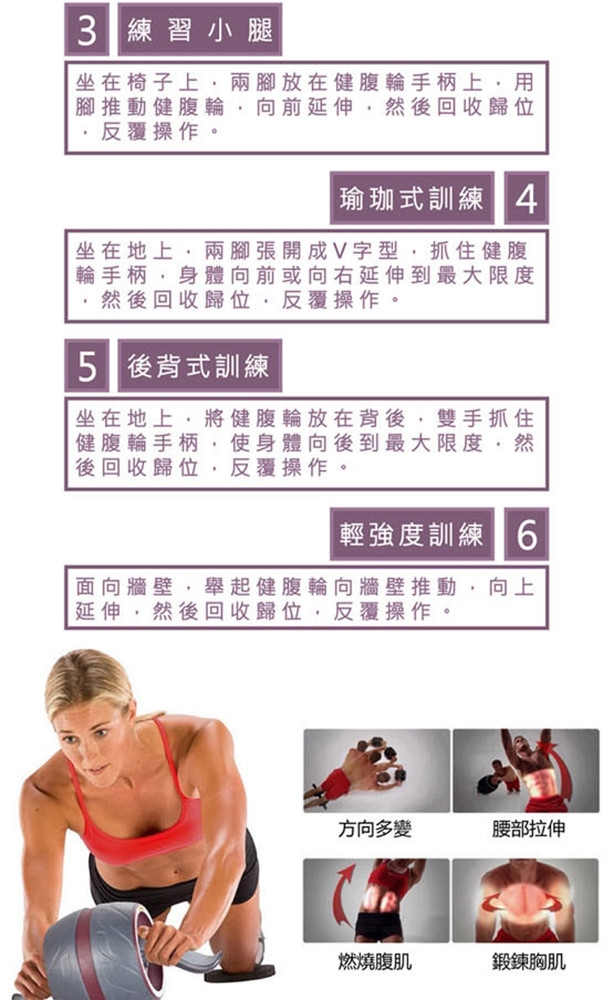 4.瑜珈式訓練:坐在地上,兩腳張開成V字型,抓住健腹輪手柄,身體向前或向右延伸到最大限度,然後回收歸位,反覆操作。