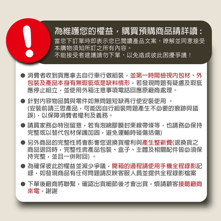 *請注意鑑賞期非試用期,若收到商品經檢察時發現有瑕疵或有任何疑慮時請勿騎乘使用。