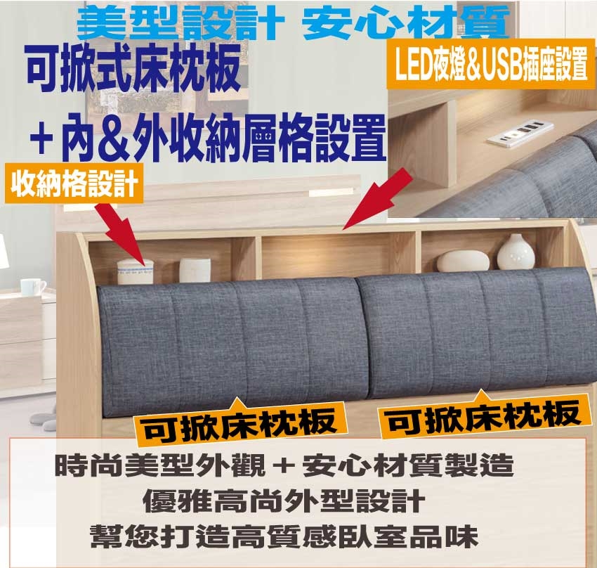 搭配床頭可掀式床枕板+內&外開放層格+LED夜燈&USB插座設置等收納空間設計