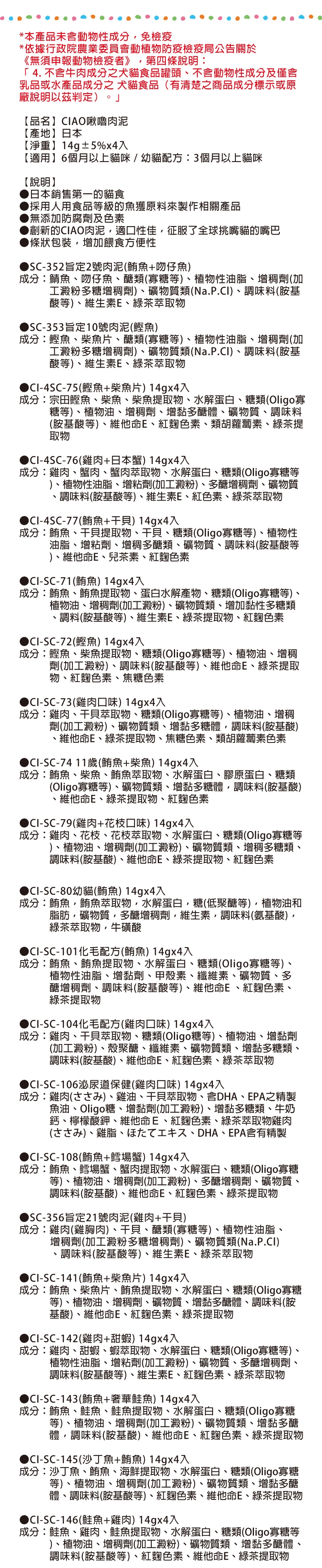 商品詳細介紹 體驗說明 不可體驗 使用方法說明 每日建議餵食量1~2條,可搭配寵物食品/藥品/飲水等食用,改善貓主子挑食,不愛喝水等習慣 注意事項 小包若沒開封請放置在乾燥陰涼處即可;若開封後若沒食用完畢,請移到其他容器內冷藏保存