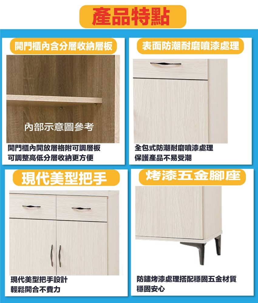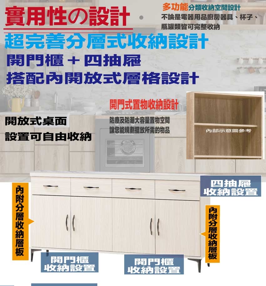 搭配採用開門櫃+四抽屜+內開放層格等收納空間設計