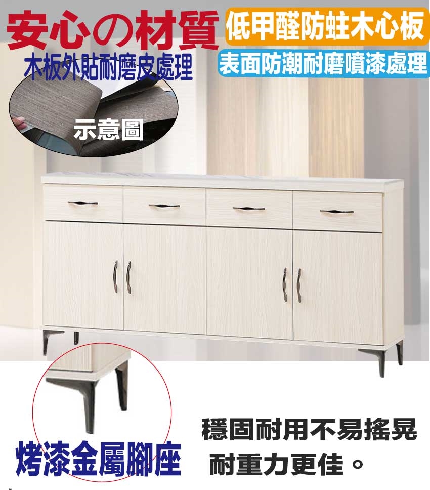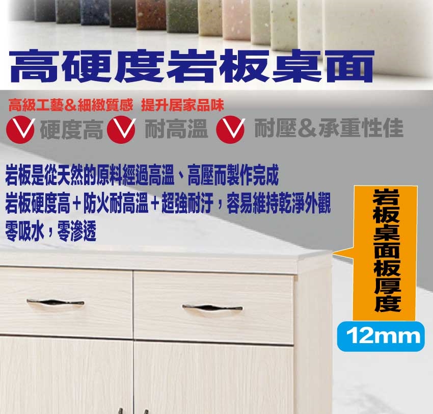採用防蛀木心板+五金滑軌結構+防夾手緩衝門片五金+烤漆五金腳座+12mm高硬度岩板桌面板等安心材質製造