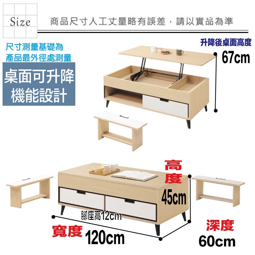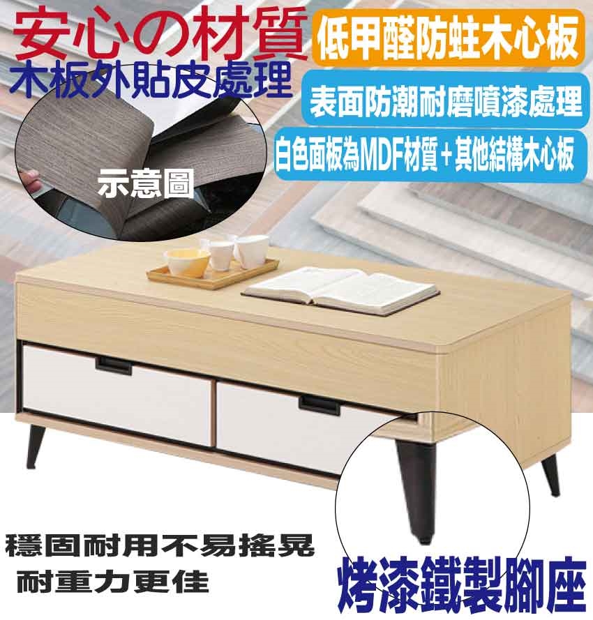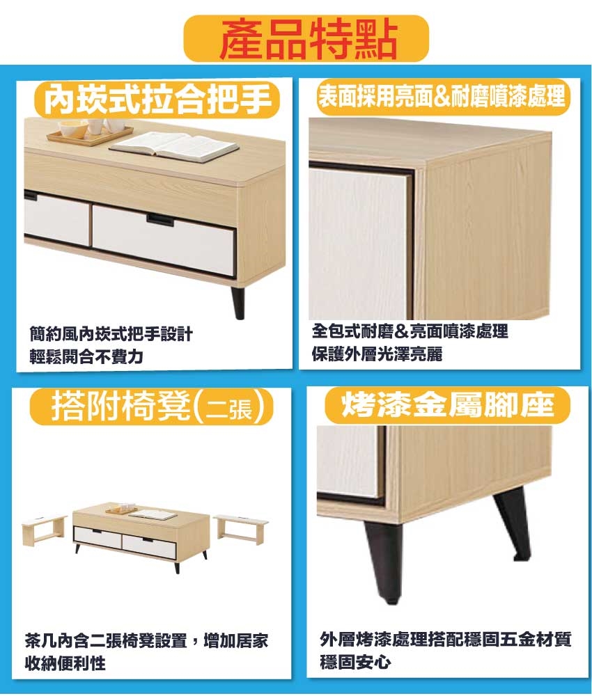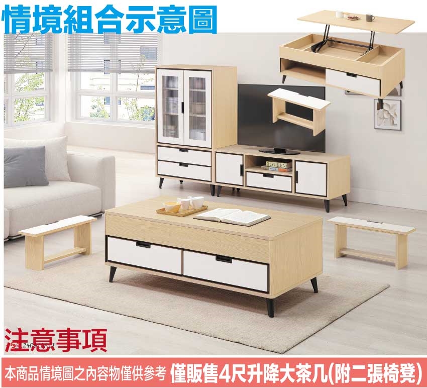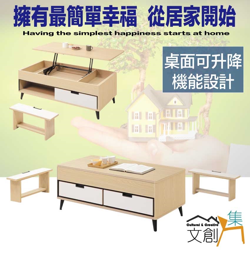 【文創集】亞卡利雙色4尺可升降大茶几(附二張椅凳) 木紋雙色系+安心材質製造,使用放心+搭配居家更便利,採用防蛀木心板+五金滑軌結構+烤漆五金腳座等安心材質製造 ,外層採用防潮耐磨噴漆處理搭配採用可升降桌面板+二抽屜+開放層格+附二張椅凳等收納空間設計,全由專人配送到家,專業安心服務,替你省下更多時間!