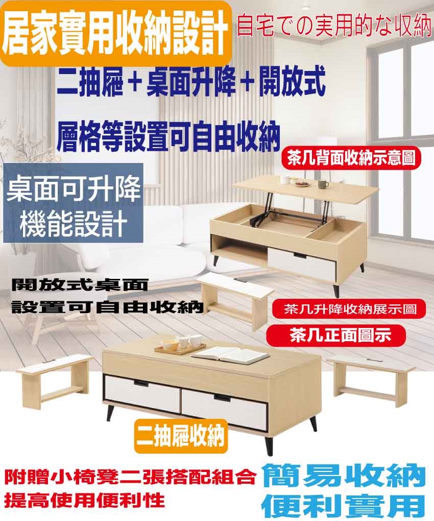 搭配採用可升降桌面板+二抽屜+開放層格+附二張椅凳等收納空間設計
