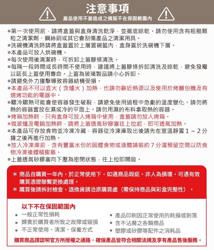 1.請勿用於明火直接加熱,以防止產品破損;堆疊收納時請加上蓋子以免產品破裂。