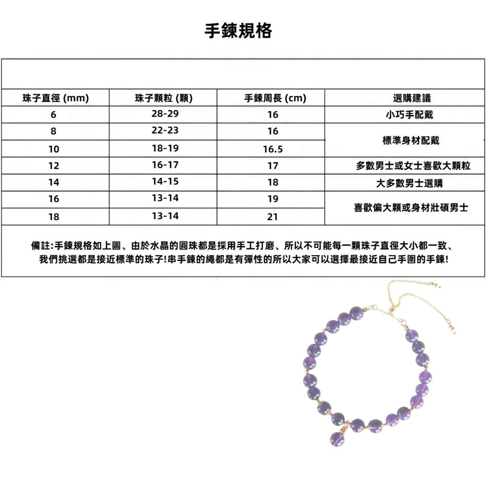 尺寸 : 紫水晶6mm、手鍊直徑約14cm(含滑扣,可自由調節,適合手圍約13-17cm)