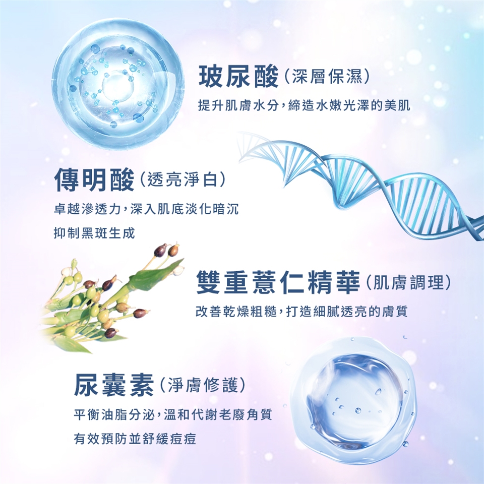 ● 內含「尿囊素」成分,有效調理油脂分泌,促進老廢角質代謝,預防並改善痘痘問題,使肌膚更潔淨平滑。