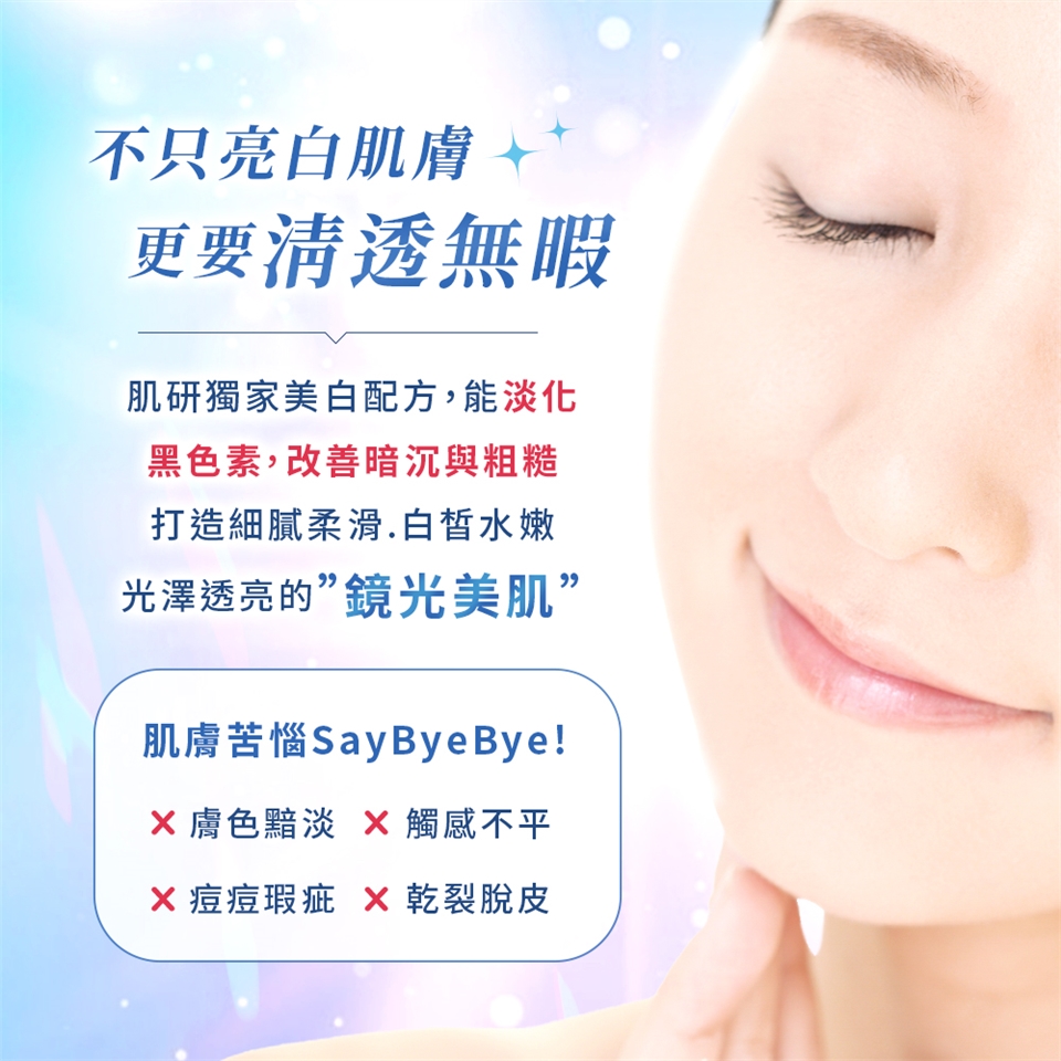 ●「美白革新,鏡光美肌」,以透明感美白為核心概念,採用突破性淨白配方,使肌膚白皙水潤,散發鏡面般的自然光澤。