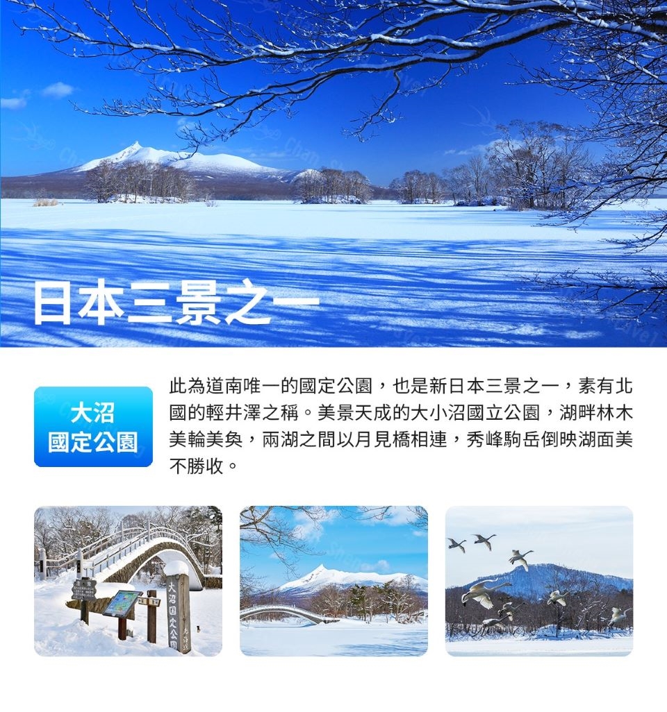 第 一 天桃園國際機場→北海道新千歲空港→大、小沼國定公園(駒岳山下美麗火山湖,現為日本新三景之一)→米其林評選三星景點~函館山百萬夜景&空中纜車(欣賞世界三大最美夜景,自然天成的弧線造型令人驚艷不已)】→湯之川溫泉區