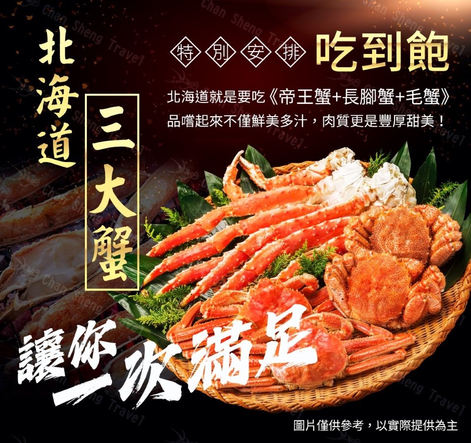 早餐:飯店享用   午餐:日式套餐        晚餐:三大螃蟹吃到飽+無酒精飲料無限暢飲 (全部無限供應)