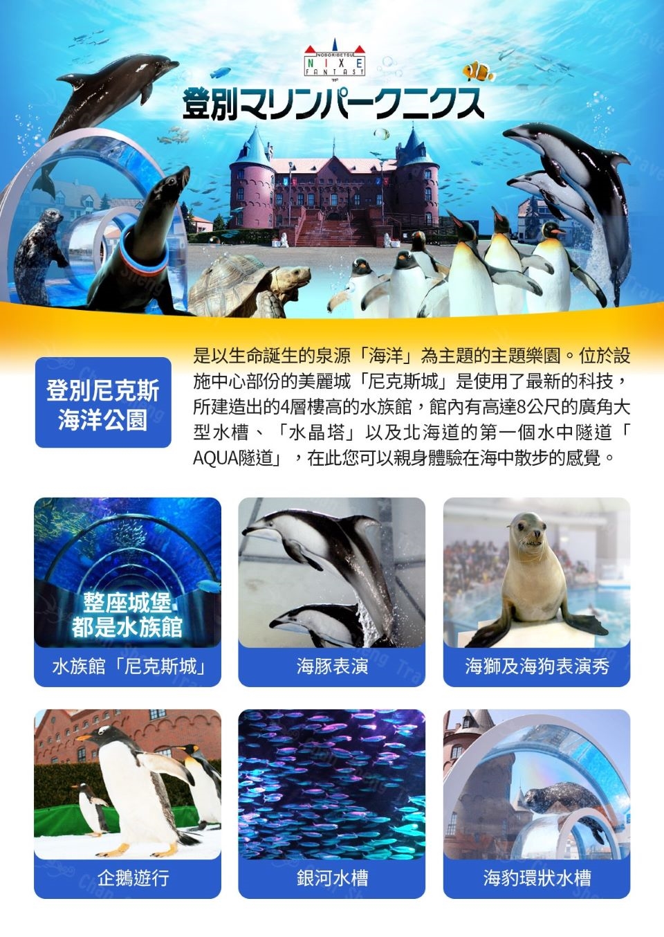 是以生命誕生的泉源「海洋」為主題的主題樂園。位於設施中心部份的美麗城「尼克斯城」是使用了最新的科技,所建造出的4層樓高的水族館,館內有高達8公尺的廣角大型水槽、「水晶塔」以及北海道的第一個水中隧道「AQUA隧道」,在此您可以親身體驗在海中散步的感覺。另外,從2F到4F挑高空間的手扶梯,可以欣賞在大型水槽裡悠遊的魚群。城的四周都是北歐式的街景,還可以看到可愛的海豚精采的表演、國王企鵝遊行、街頭藝人演出等。