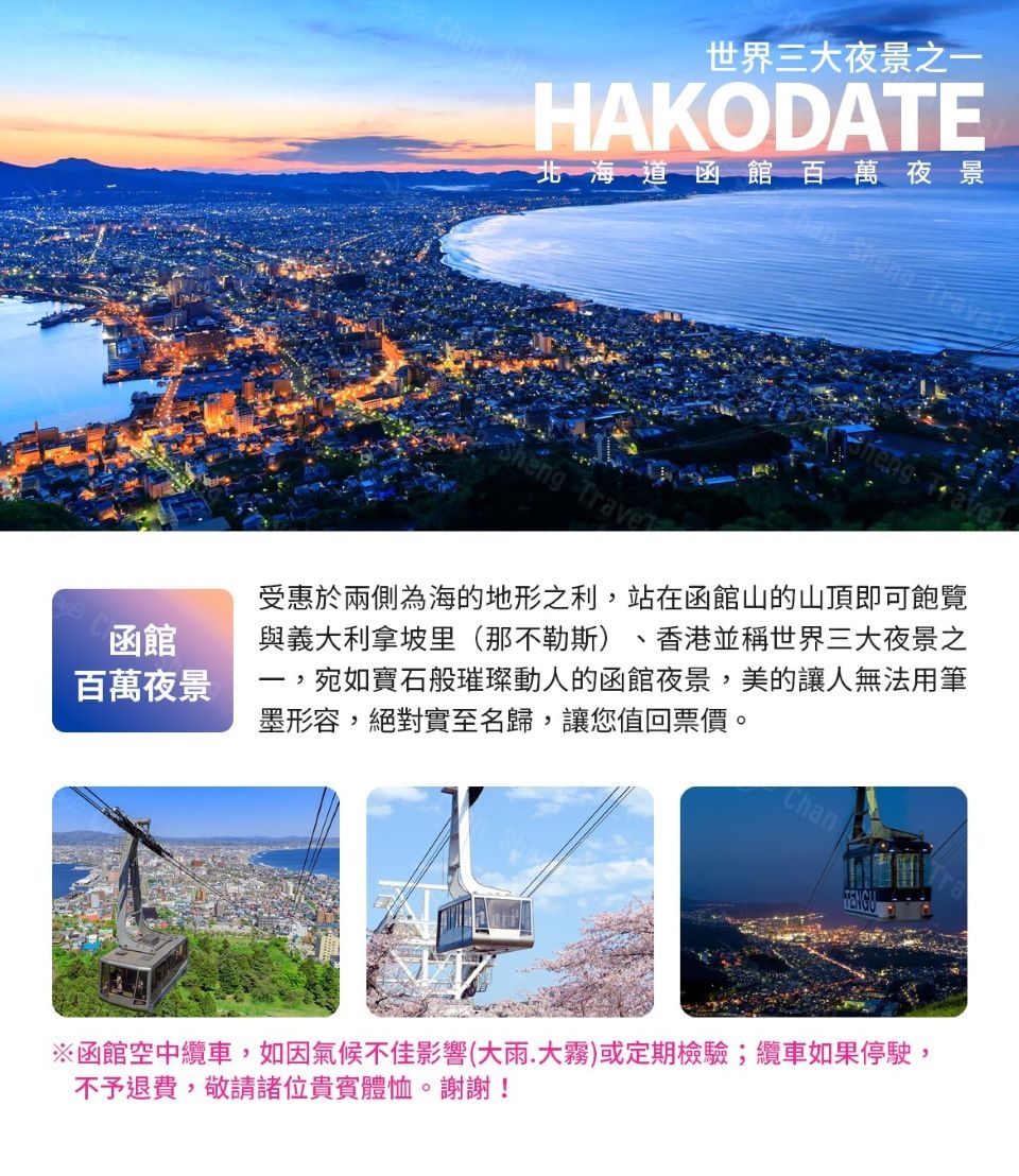 函館百萬夜景~空中纜車,如因氣候不佳影響(大雨.大霧)或定期檢驗;纜車停駛,不予退費,敬請諸位貴賓體恤。謝謝!