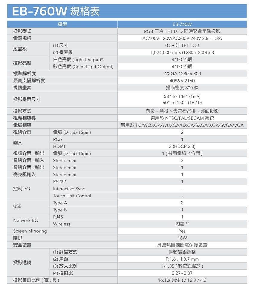 EPSON EB-760W 超短焦高亮彩雷射投影機