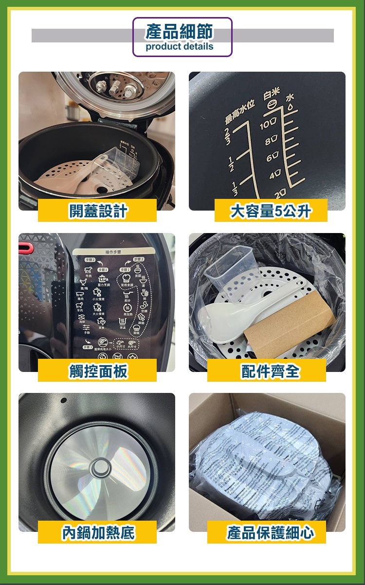 內容物 主機、內鍋、飯湯勺、量杯、電源線、拆卸式內鍋蓋、蒸架、使用手冊、保證卡、原廠彩盒
