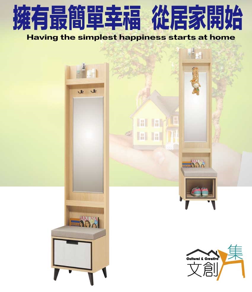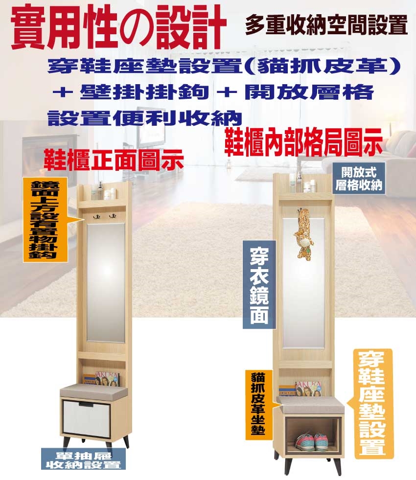 搭配採用單抽屜+穿衣鏡面+穿鞋坐墊設置等收納空間設計