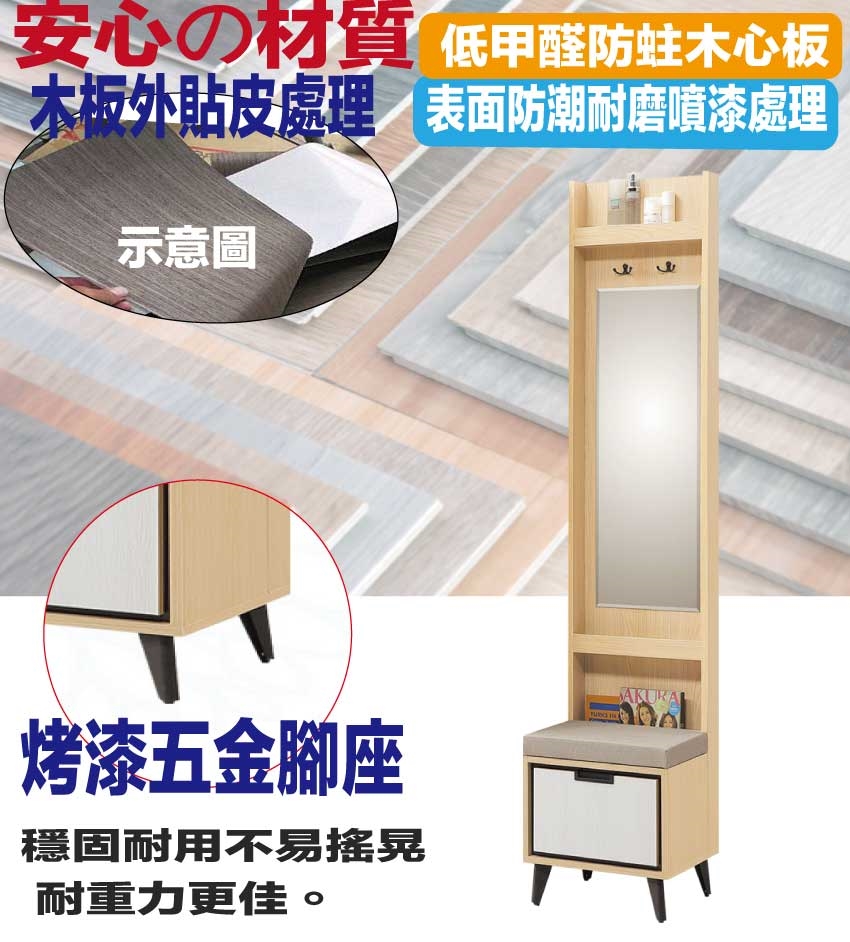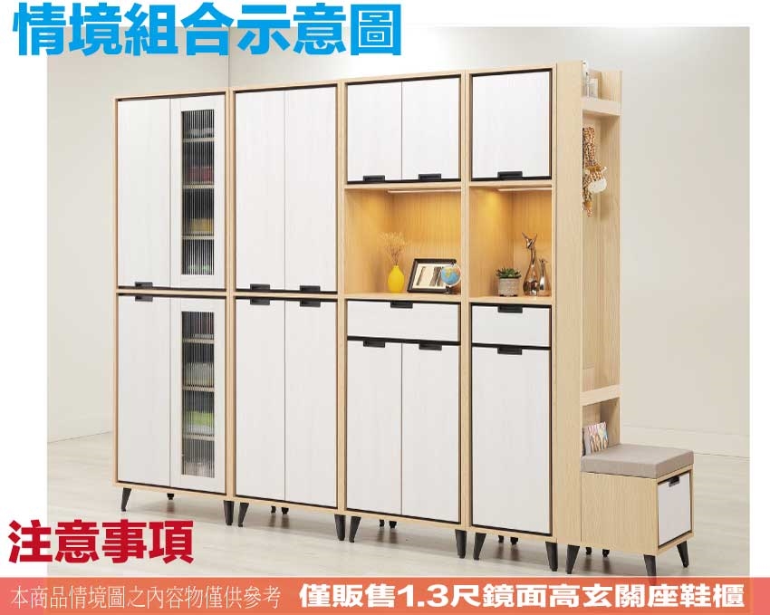 【文創集】亞卡利雙色1.3尺高屏風鏡面玄關座鞋櫃 木紋雙色系+安心材質製造,使用放心+搭配居家更便利,採用防蛀木心板+烤漆五金腳座+強化玻璃鏡面+貓抓皮革坐墊等安心材質製造 ,外層採用防潮耐磨噴漆處理搭配採用單抽屜+穿衣鏡面+穿鞋坐墊設置等收納空間設計,全由專人配送到家,專業安心服務,替你省下更多時間!