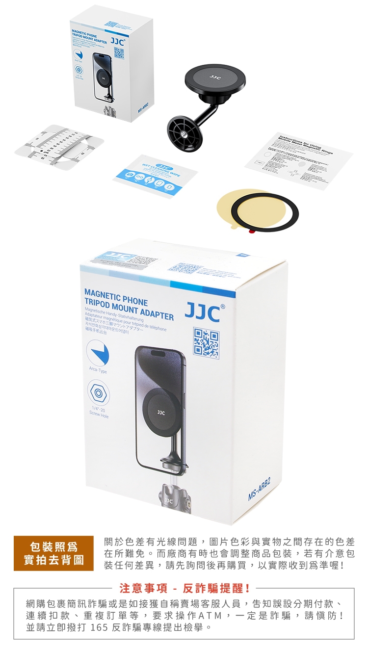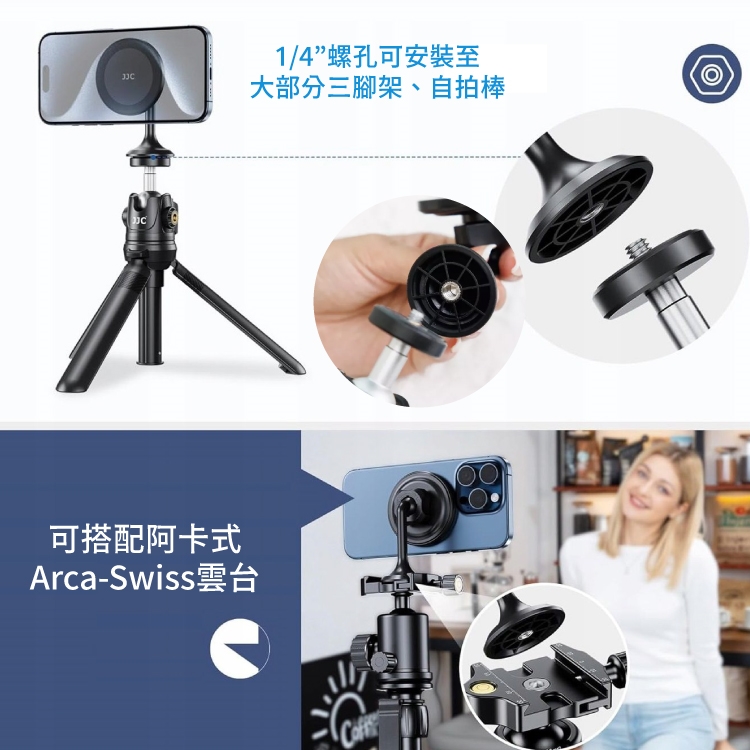●【品名】JJC有無MagSafe手機皆適磁吸式支架Arca-Swiss底座MS-ARB2(附磁鐵貼紙&1/4"螺孔;相容阿卡式快拆板;相容三腳架.自拍棒)