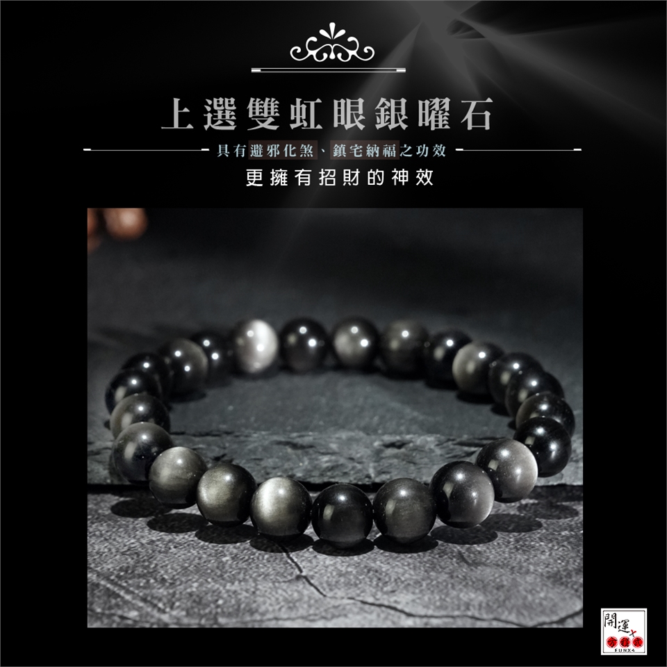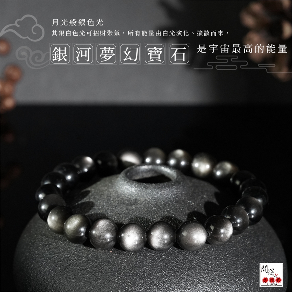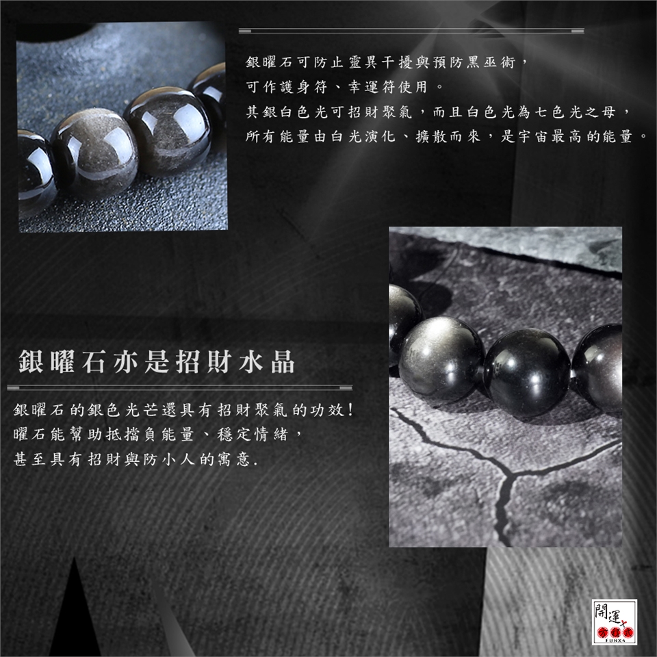銀曜石是黑曜石家族中之稀有品種。 ・銀曜石有助加強人的信念、自信心、果斷力,需要魄力氣魄的人最適合佩戴銀曜石。 ・銀曜石亦是招財水晶之一。黑色原色極度辟邪,能強力化解負能量;而銀色的眼有招財功效。 ・銀曜石可防止靈異干擾與預防黑巫術,可作護身符、幸運符使用。其銀白色光可招財聚氣,而且白色光為七色光之母,所有能量由白光演化、擴散而來,是宇宙最高的能量。