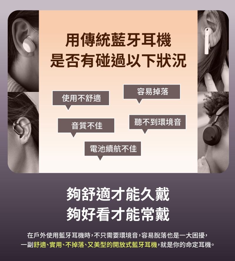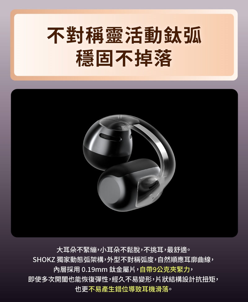 ● 不對稱弧度設計 + 自帶 9g 夾緊力,不挑耳型都適配。