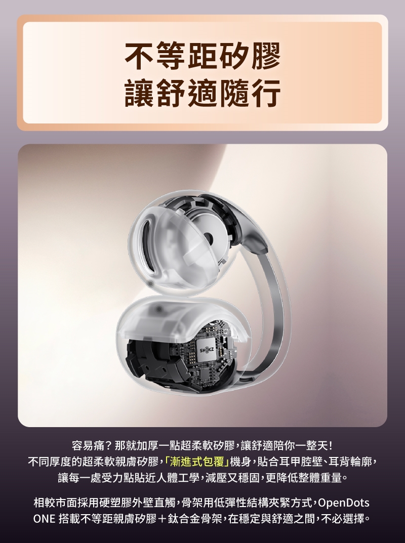 ● 不等距親膚矽膠 + 鈦合金骨架,配戴舒適穩固。