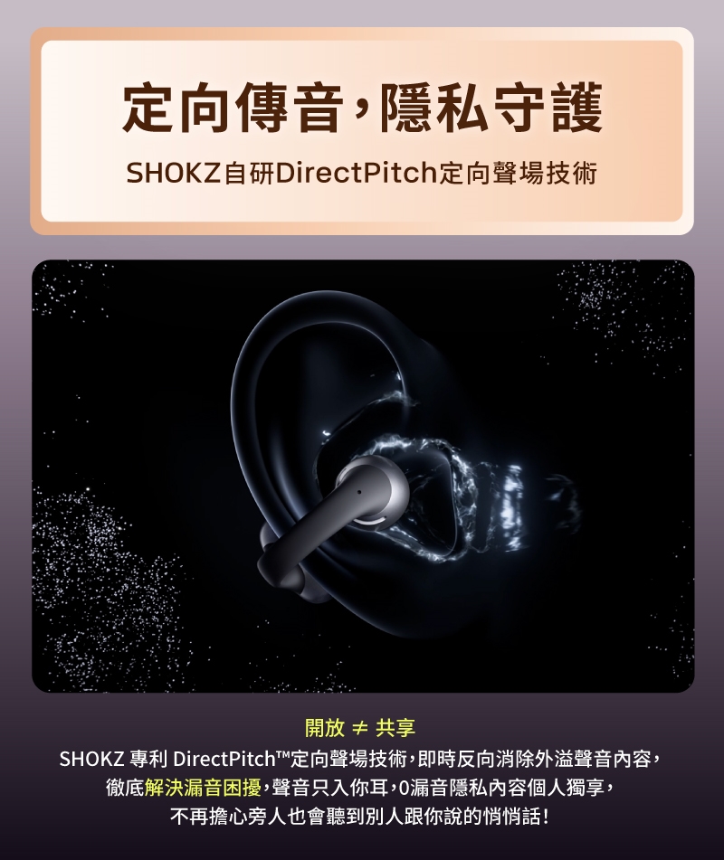 ● Shokz DirectPitch™ 定向聲場技術,解決漏音困擾。