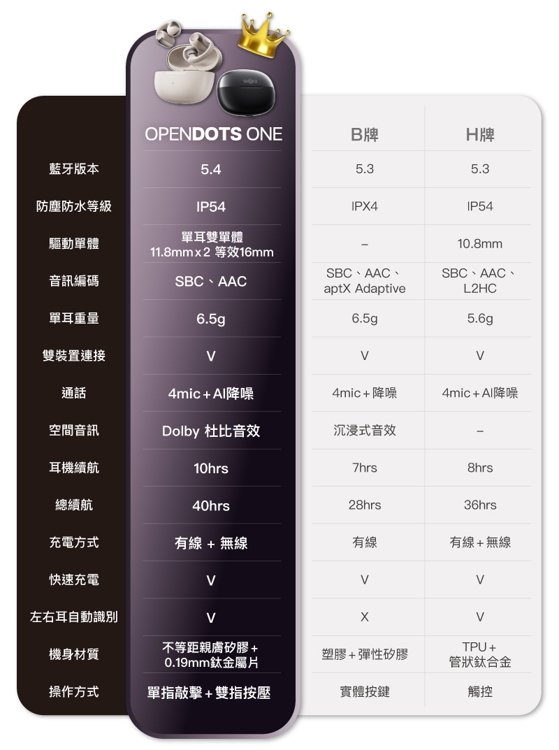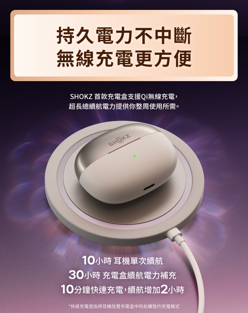 ● 支援 Qi 無線充電,單耳機10小時續航,總續航40小時。