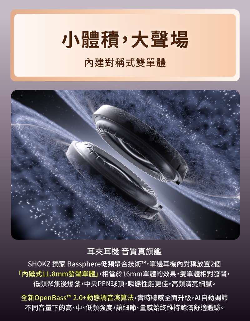 ● OpenBass™ 2.0+ 動態調音演算法,自動調節三頻強度。