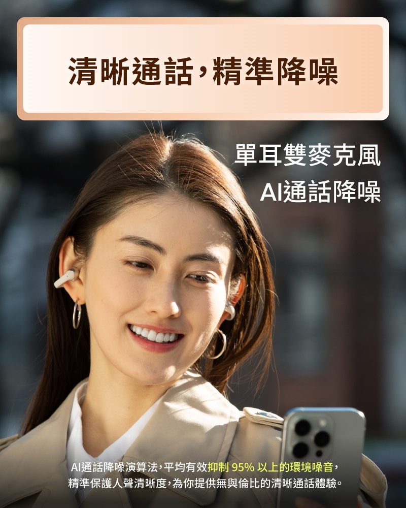 ● 雙耳 4 個麥克風,搭配 AI 降噪演算法,有效抑制 95% 噪音。