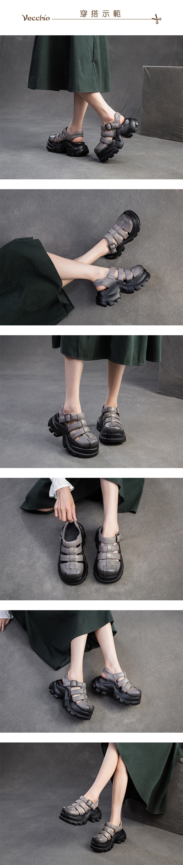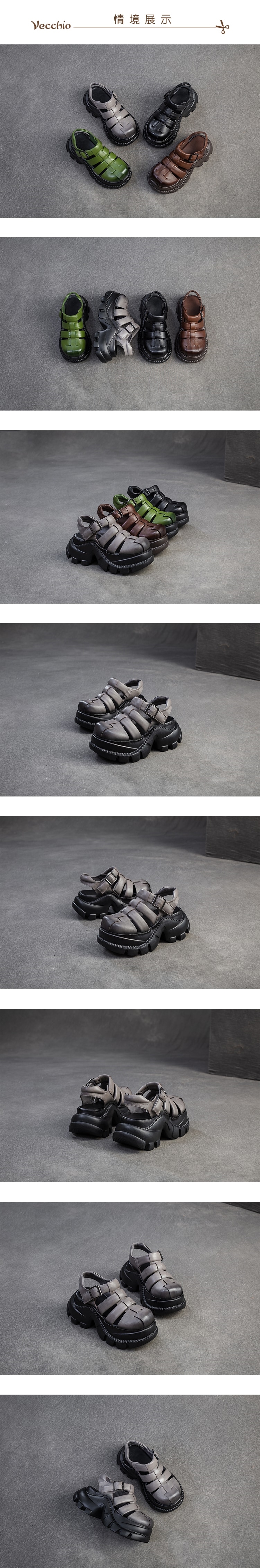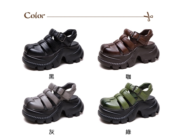 【VECCHIO】真皮編織包頭厚底羅馬涼鞋/真皮頭層牛皮復古魚骨編織包頭鬆糕厚底羅馬涼鞋 女鞋 灰