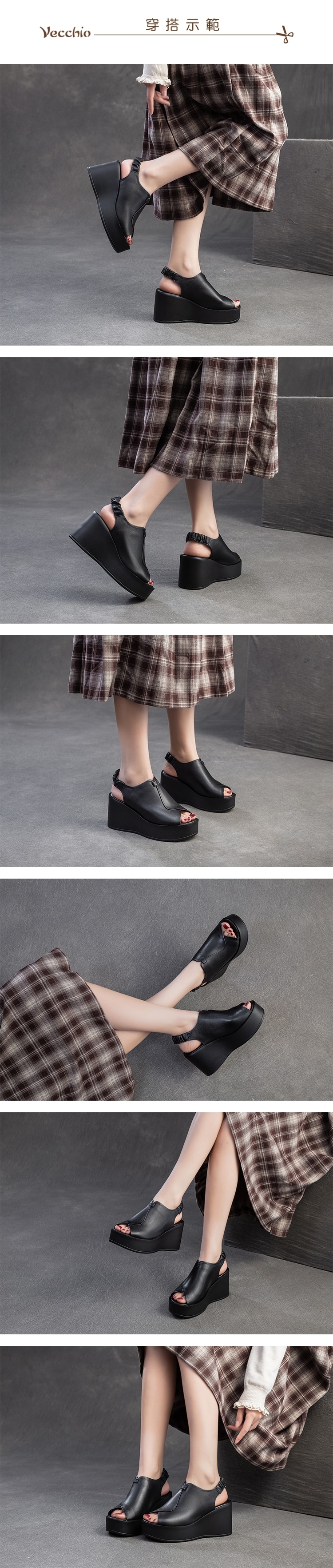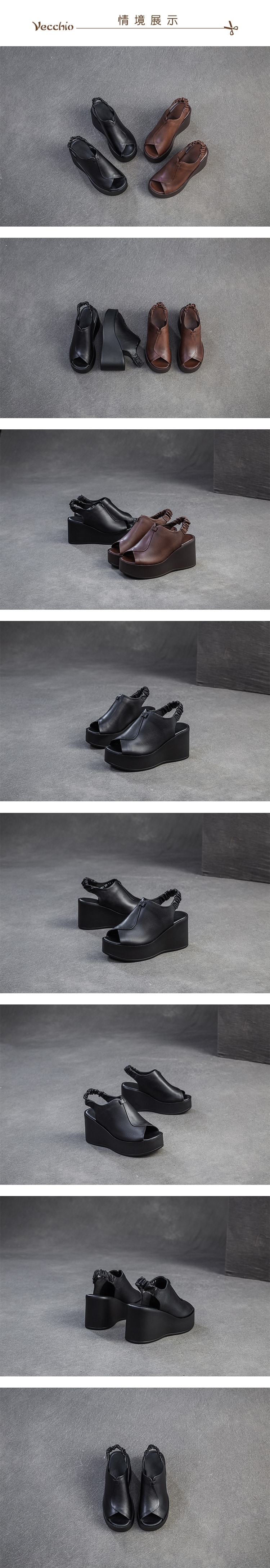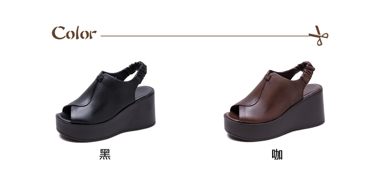 【VECCHIO】真皮魚口坡跟厚底涼鞋/真皮頭層牛皮復古典雅魚口露趾坡跟厚底涼鞋 女鞋 黑