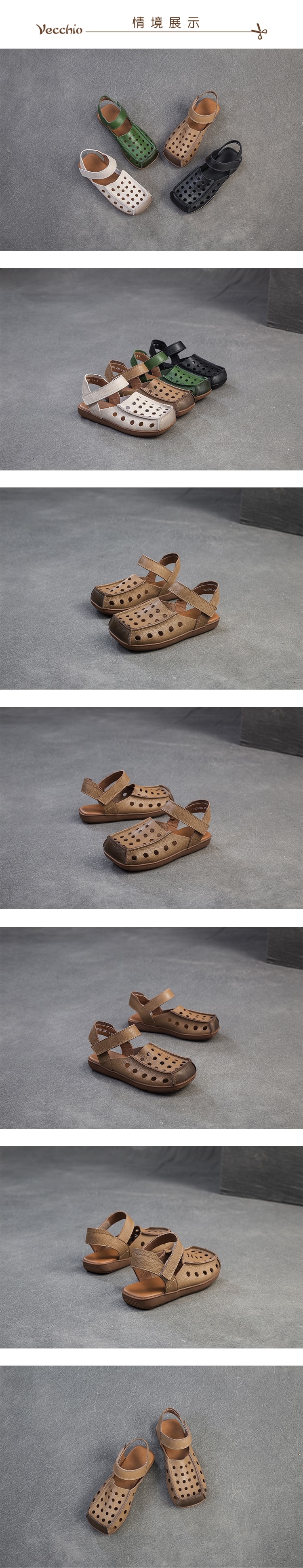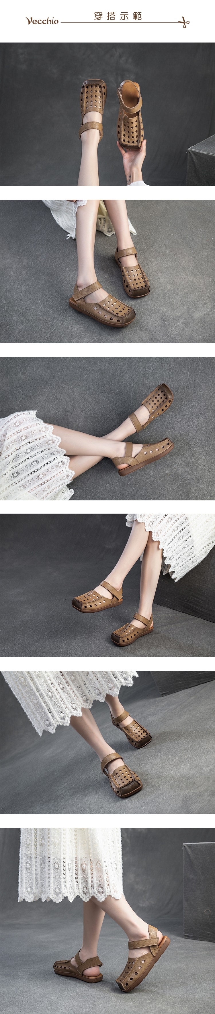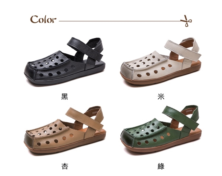 【VECCHIO】真皮洞洞方頭平底包頭涼鞋/真皮頭層牛皮縷空洞洞寬楦方頭魔鬼粘平底包頭涼鞋 女鞋 杏