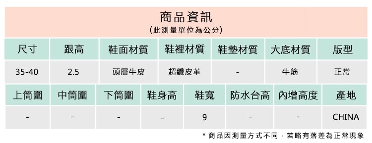 2.鞋類商品依功能及用途之不同,鞋底各有其止滑係數之個別不同,使用鞋類商品請用於正常平坦之路面,非雨鞋或雨靴類商品,請避免穿著於下雨濕滑路面上行走。