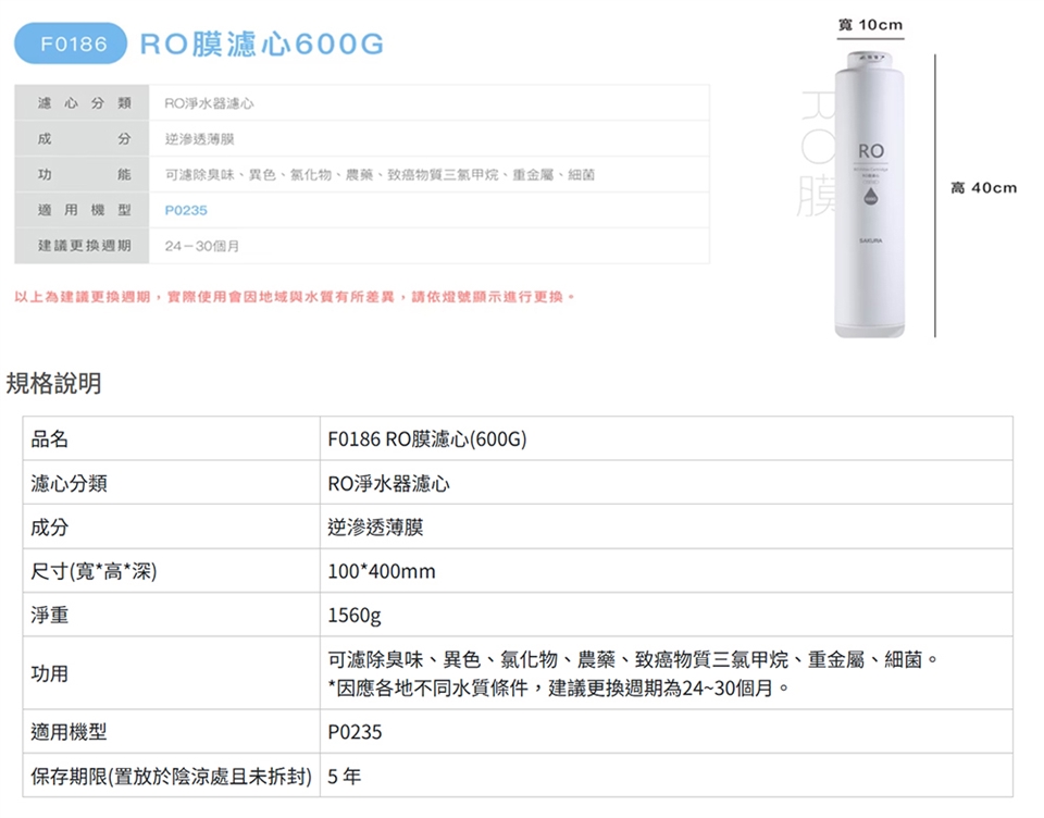 第二道:F0186「RO膜濾芯600G」×1支