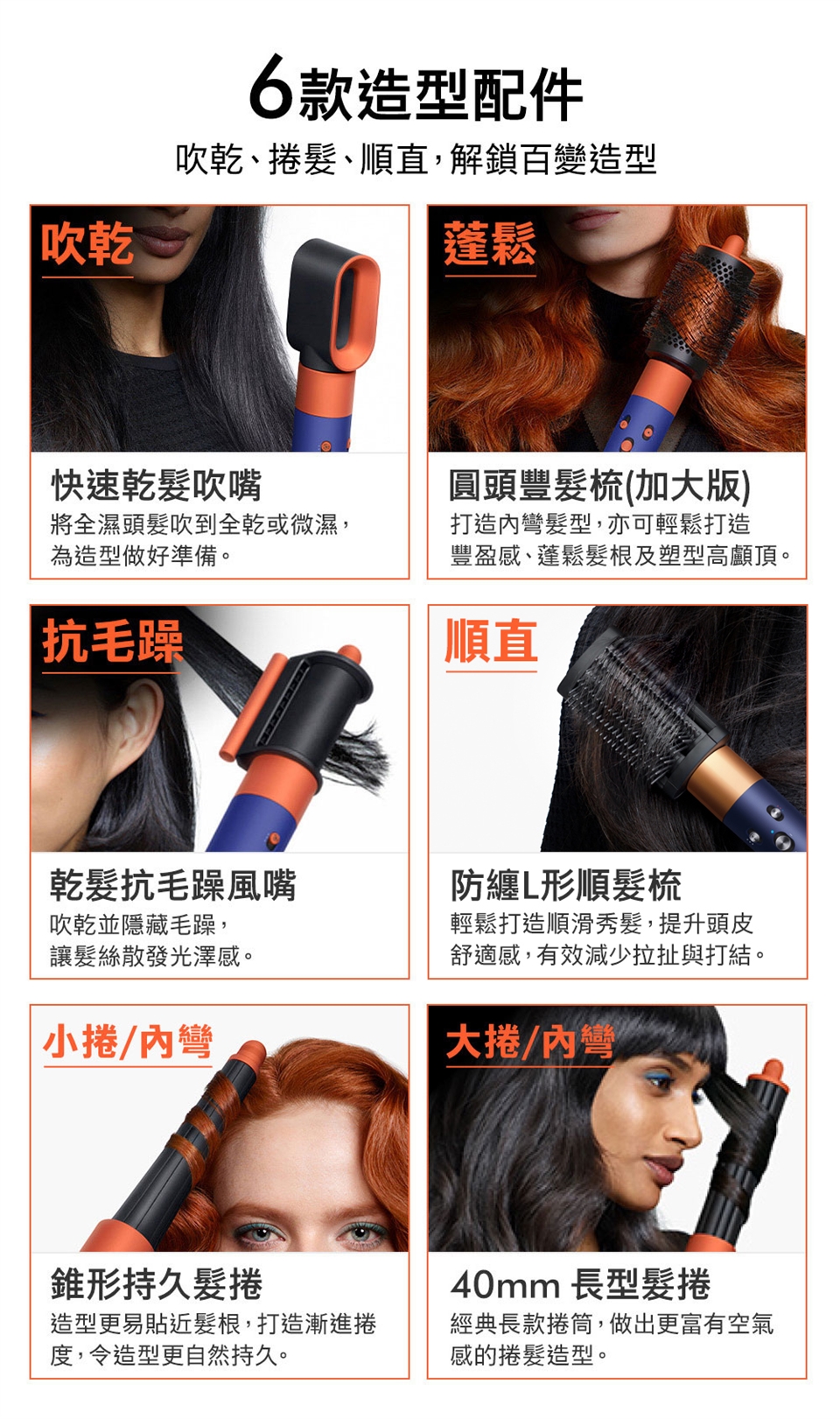 配件:快速乾髮吹嘴Fast dryer、圓頭豐髮梳(加大版)、乾髮抗毛躁風嘴、軟質順髮梳、錐形持久髮捲、40mm AirwrapTM長型髮捲、防纏L形順髮梳、順髮梳、禮盒(收納盒新設計支援使用手機支架)。
