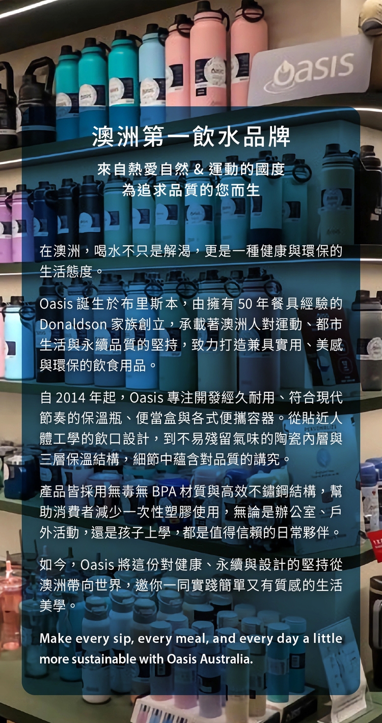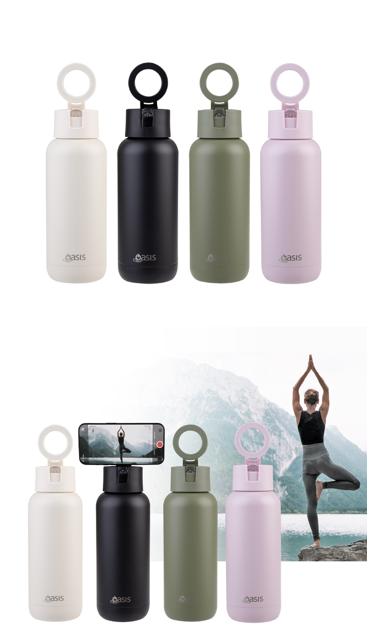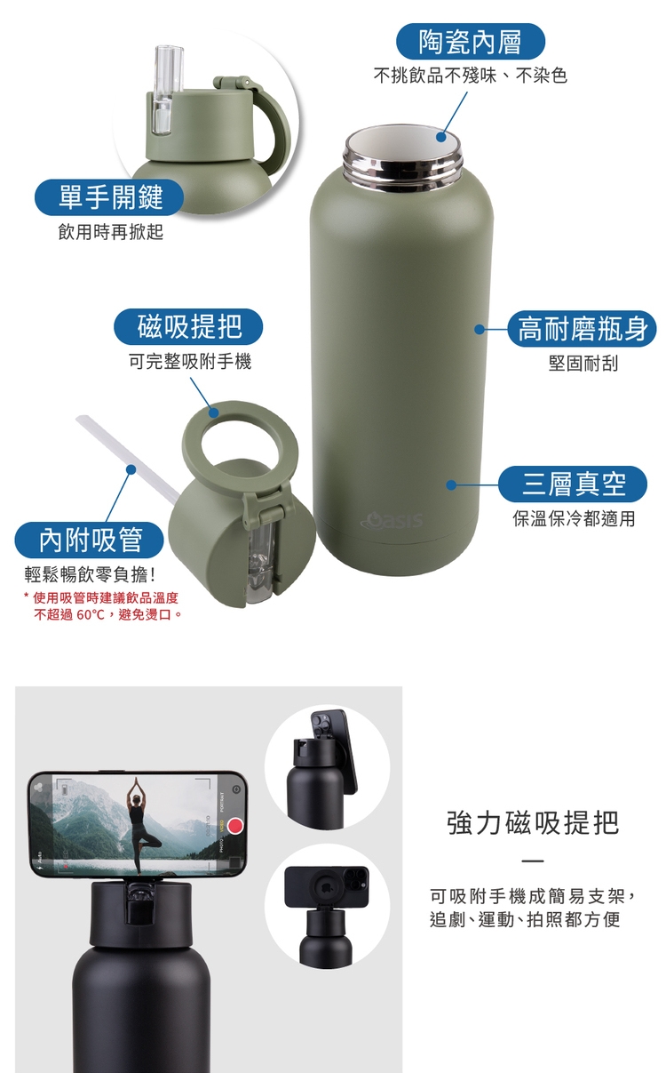 Oasis 創新設計的水瓶,配備強力磁吸提把,不只能穩穩提握,還能輕鬆吸附手機,橫放直立都OK,隨時變身迷你支架,辦公追劇兩不誤!